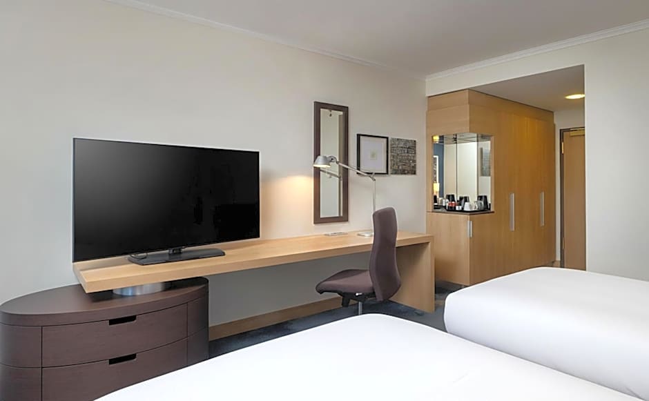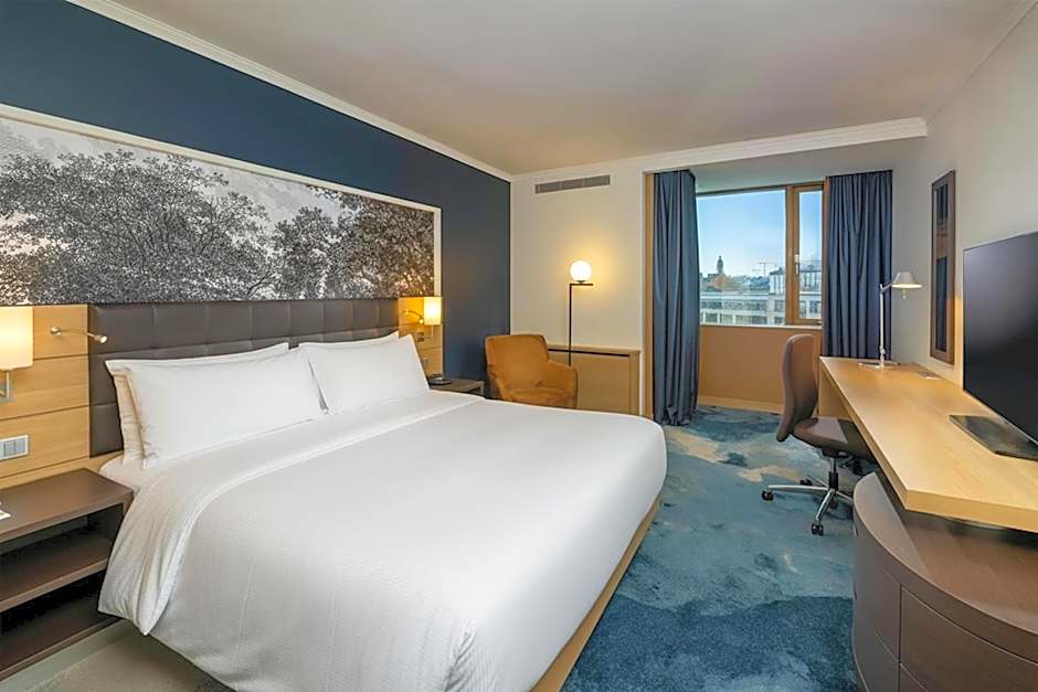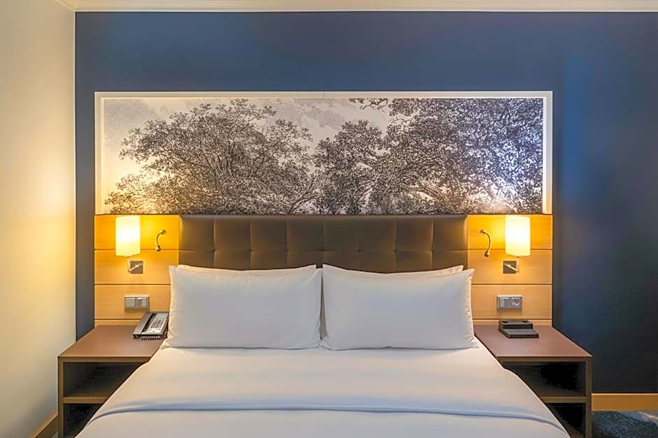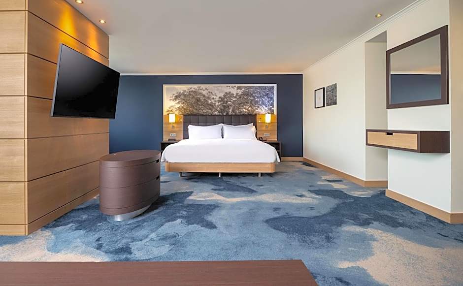 Featuring a Hilton Serenity Bed, a separate seating area, a desk and a 32-inch flat-screen TV.